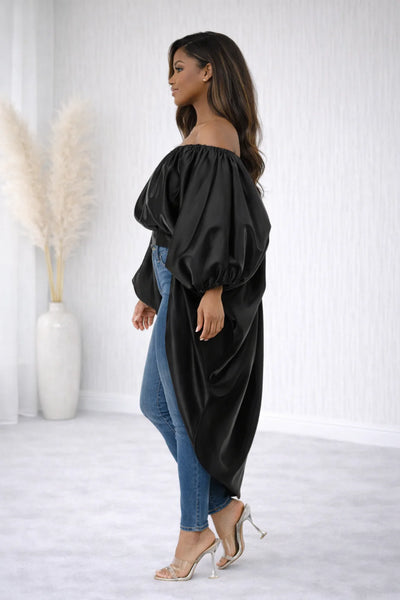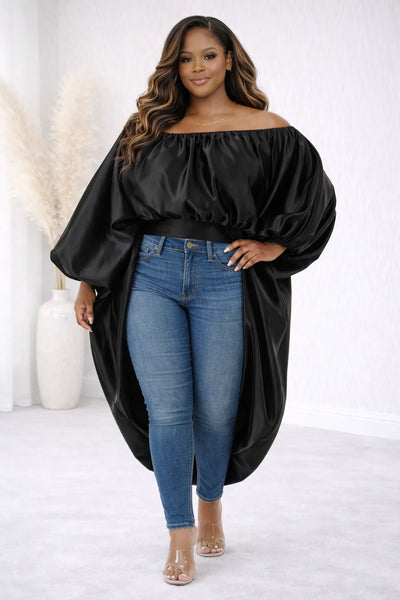 Embrace the allure of the Flirty Mullet Top, an exquisite blend of sophistication and playfulness. Crafted from sumptuous satin, this hi-lo masterpiece gracefully drapes with an oversized silhouette, offering the versatility to be worn on or off the shoulder. For a tailored fit, an option to size down allows for a personalized elegance that is both captivating and refined.