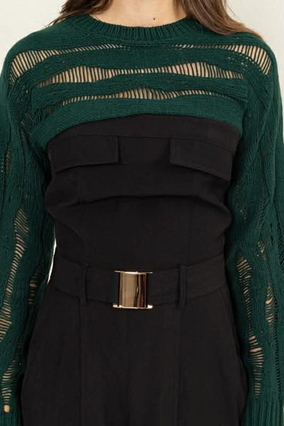 Airy & Edgy: An open-knit construction that breathes, making it perfect for layering over a bralette or that Ribbed Mock Neck.